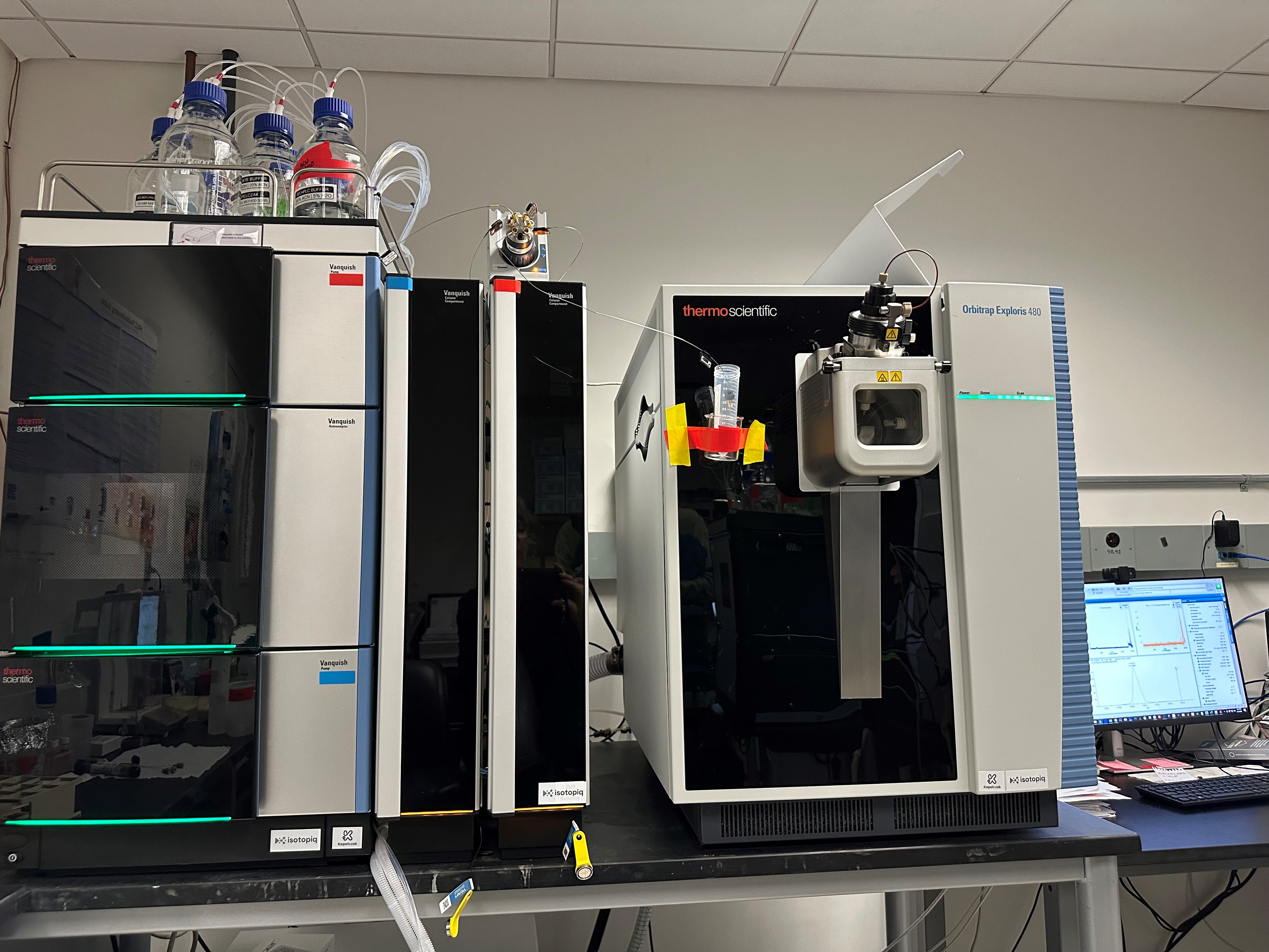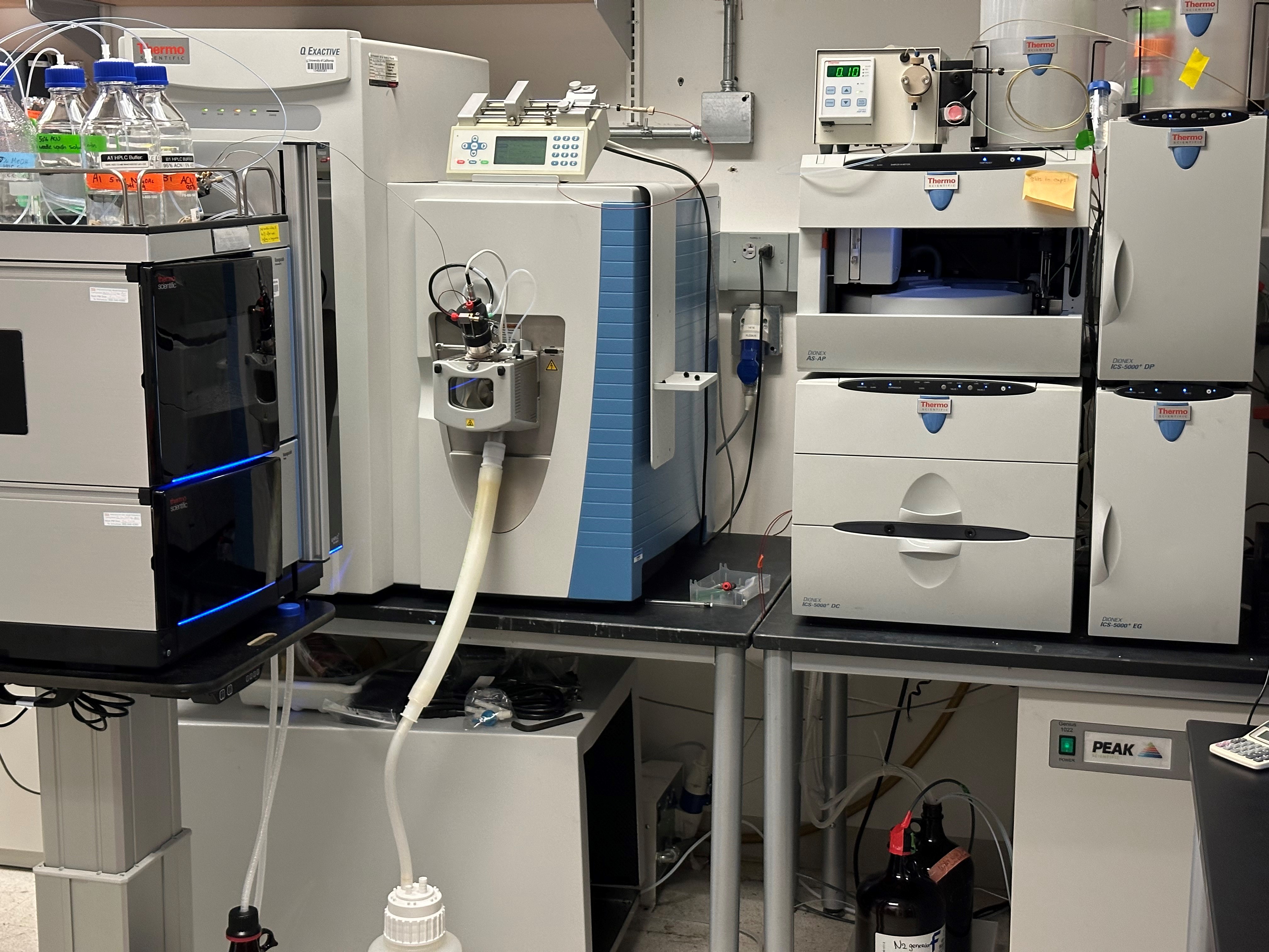 Data is collected using two state-of-the-art high mass accuracy Thermo Orbitrap mass spectrometers: an Exploris 480 and a Q-Exactive that are coupled to a Vanquish Duo and a Vanquish Flex Binary UHPLC chromatography system, respectively. In addition, we have a Thermo Ion Chromatography System (ICS) 5000 for increased sensitivity and selectivity of certain acids, phospho-carbohydrates, and nucleotides. The LC-MS systems allow us to detect metabolites in full-scan mode (using a wide m/z mass range) or in SIM mode (smaller m/z windows for measurement of target metabolites with enhanced sensitivity). The instruments can be run up to 480K and 140K resolution, respectively. The increased resolution allows us to distinguish 13C-labeled metabolites from 15N-labeled or 18O-labeled metabolites in the same sample. In addition, the instruments can perform fragmentation of selected ions, which assists in the identification and verification of metabolites.